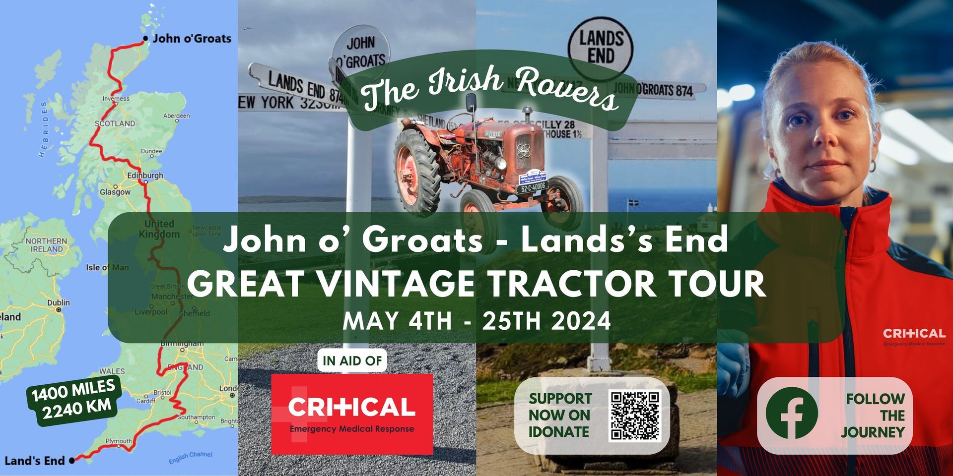The Irish Rovers, a group of four friends from County Cork, are raising funds for CRITICAL Emergency Medical Response by driving four vintage tractors the length of the UK during May 2024. They will start from John o' Groats in Scotland and finish at Land’s End in England, covering 1400 miles (2240 kilometres) in 22 days.